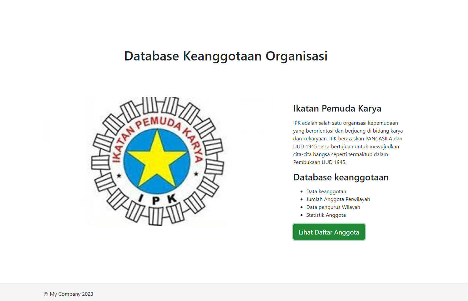 Database keanggotaan organisasi kepemudaan yang berorientasi dan berjuang di bidang karya dan kekaryaan berazaskan PANCASILA dan UUD 1945 serta bertujuan untuk mewujudkan cita-cita bangsa seperti termaktub dalam Pembukaan UUD 1945. Setiap pengguna atau anggota dapat melihat dan berkontribusi mengelola Data keanggotan, Jumlah Anggota Perwilayah, Data pengurus Wilayah, Statistik Anggota.