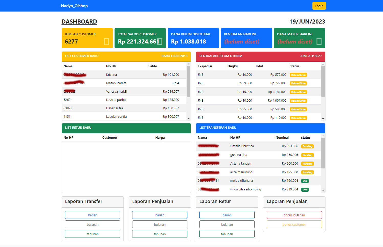 Sistem manjemen Toko Online yang memudahkan mengelola customer, bukti transfer customer, saldo customer, paket yang di kirim, keuangan, dan jasa expedisi yang digunakan